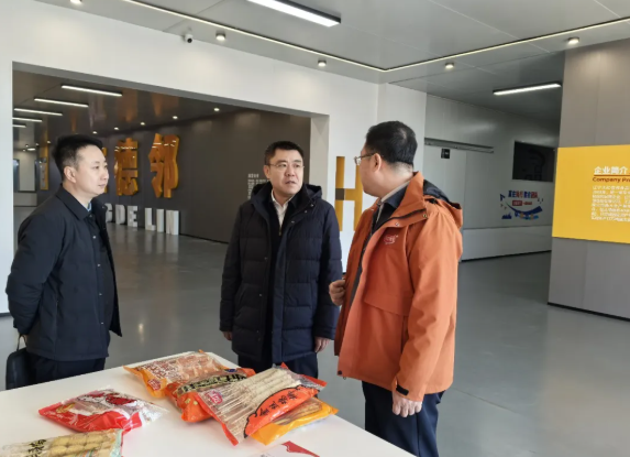 在辽宁大红德邻食品有限公司,曹德强详细了解企业产品种类、生产销售及市场拓展情况,对企业发展成效给予肯定,并鼓励企业立足产品优势,持续深耕食品加工领域,不断做大做强自主品牌,提升产品附加值和市场竞争力。
